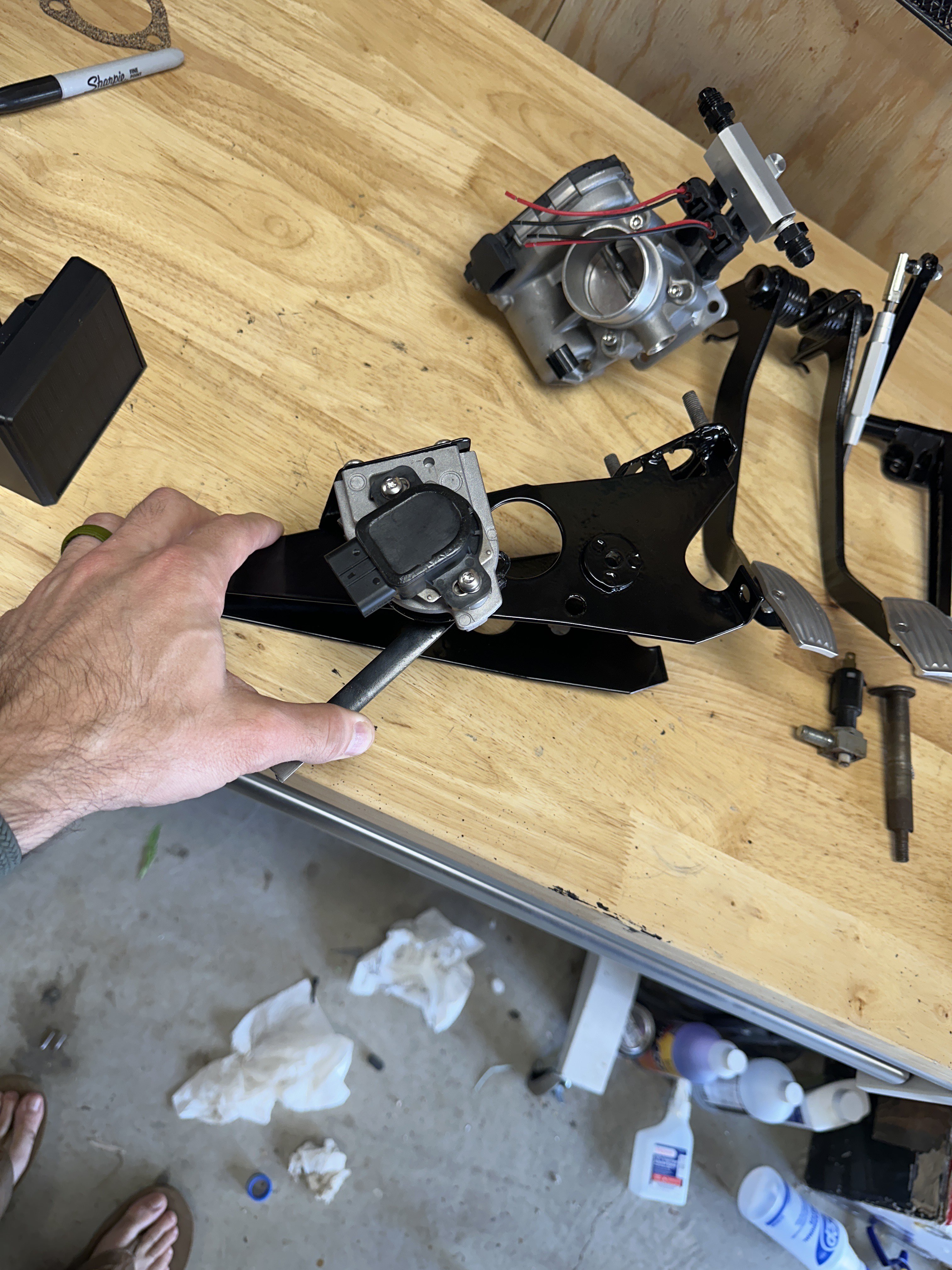 One of the drawbacks of the drive by wire setups is the requirement for a pedal sensor. This means either retrofitting your existing pedal to work with a pedal sensor or purchasing a bolt in pedal and replacing your existing one. In my setup I am running the retrofitted option modeled after a setup by Steve Blakemore or @turbocoopersport on Instagram. Essentially a small rose joint connecting the DSN Retrosport pedal to the Honda pedal sensor pictured above.
